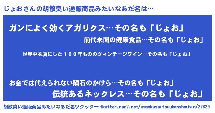 | 意味不明あだ名 | 『住所不定無職じょお(4歳)』『自称じょお』 |