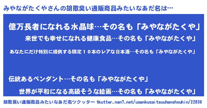| ヘコむあだ名 | 『みやにゅー』『酢こんぶ』『みやお』 |
