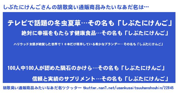| 意味不明あだ名 | 『住所不定無職しぶたにけんご(74歳)』 |