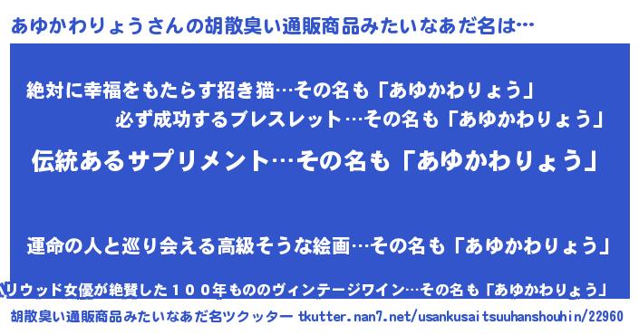 | 意味不明あだ名 | 『とにかく怪しいあゆかわりょう』 |