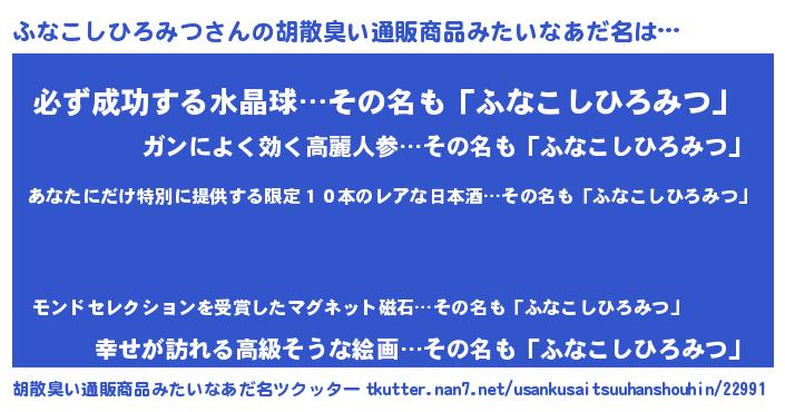 | 男性向けラノベタイトル風あだ名 | 『この素晴らしい世界にふなこしひろみつを!』 |
