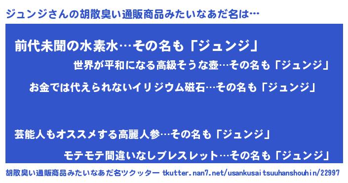 | ヘコむあだ名 | 『ジュンジ(笑)』『ジュもー』『豆乳』 |
