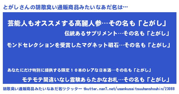 | ヒーロー風カッコイイあだ名 | 『慈愛の使者とがし』『究極戦士トガシ』 |