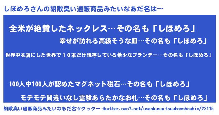 | 意味不明あだ名 | 『住所不定無職しほめろ(77歳)』 |