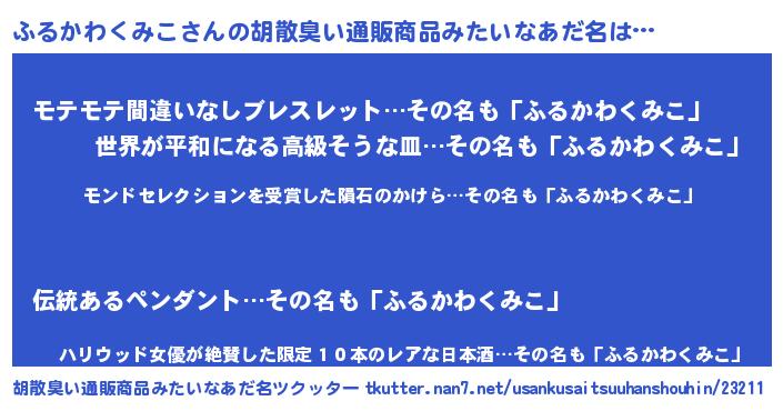 | 男性向けラノベタイトル風あだ名 | 『ノーゲーム・ノーフルカワクミコ』 |