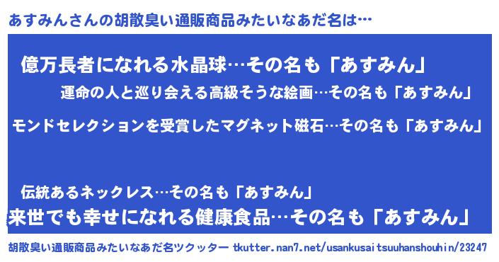 | ヒーロー風カッコイイあだ名 | 『慈愛の使者あすみん』『ネオアスミン』 |