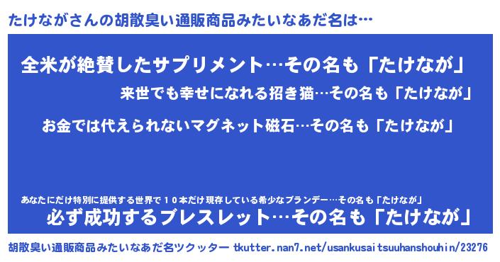 | ヘコむあだ名 | 『たけを』『たけにー』『なまこ酢』 |