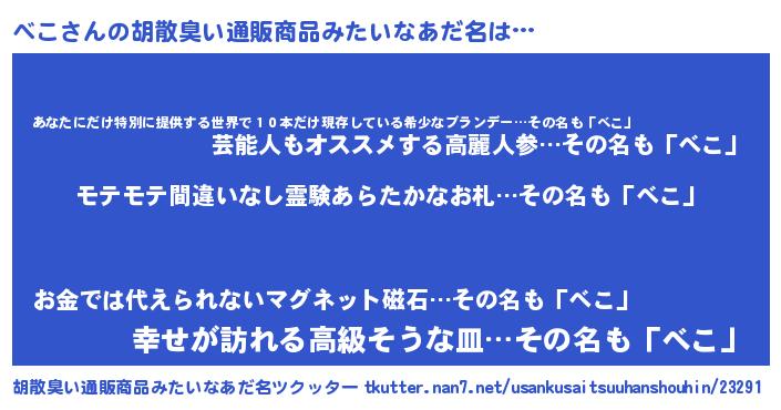 | 意味不明あだ名 | 『ペロリンべこ』『住所不定無職べこ(74歳)』 |