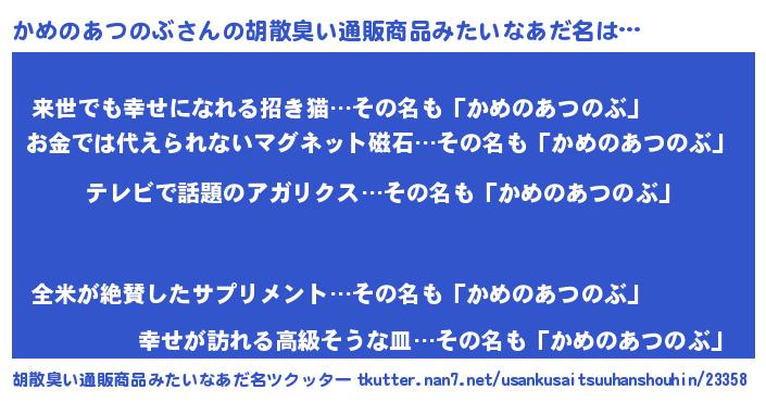 | 料理風あだ名 | 『ヘルシー!かめのあつのぶのピリ辛酒蒸し!』 |