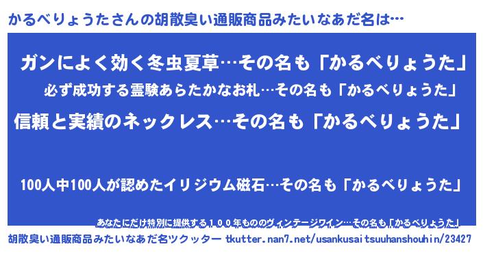 | 男性向けラノベタイトル風あだ名 | 『ダンジョンにかるべりょうたを求めるのは間違っているだろうか』 |
