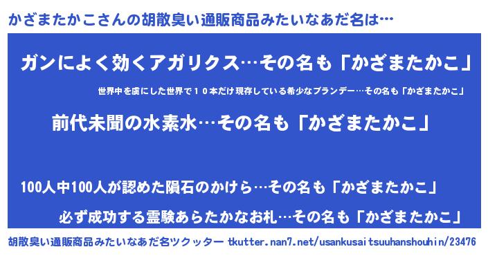 | ヘコむあだ名 | 『かざまたかこ(震え声)』『かざにゅー』 |