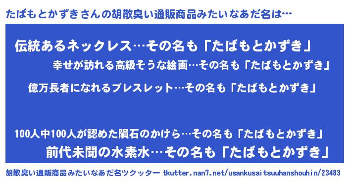| 男性向けラノベタイトル風あだ名 | 『たばもとかずきに滅ぼされるだけの簡単なお仕事です』 |