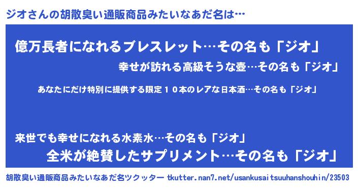 | 男性向けラノベタイトル風あだ名 | 『この素晴らしい世界にジオを!』 |