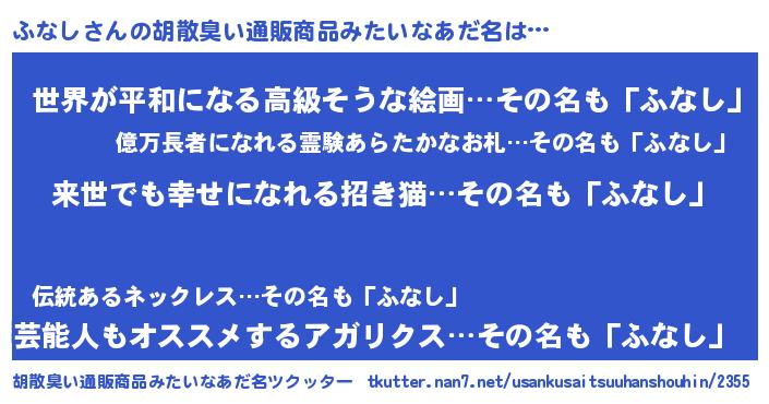 | ヘコむあだ名 | 『ふなし(笑)』『なまこ酢』 |
