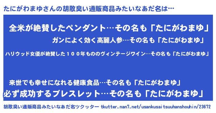 | 意味不明あだ名 | 『住所不定無職たにがわまゆ(13歳)』 |