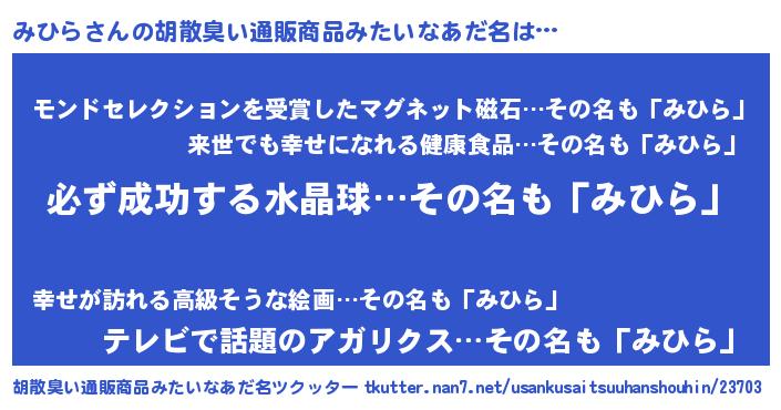 | 男性向けラノベタイトル風あだ名 | 『みひらの憂鬱』『ミヒラスレイヤー』 |