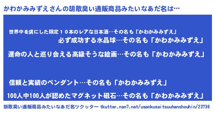 | 肩書あだ名 | 『かわかみみずえ総理大臣』 |