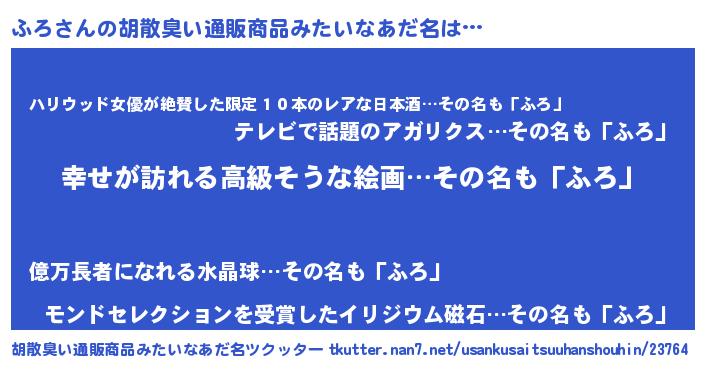 | 女子向けラノベタイトル風あだ名 | 『ふろの雑貨屋さん』『死神ふろの再婚』 |
