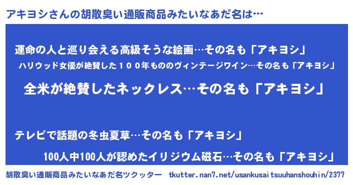 | ヒーロー風カッコイイあだ名 | 『炎刃騎士アキ』『ウルトラアキヨシマン』 |