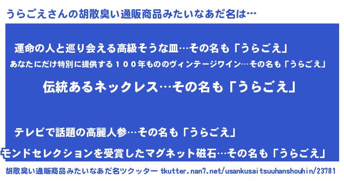 | 男性向けラノベタイトル風あだ名 | 『転生したらうらごえだった件』 |