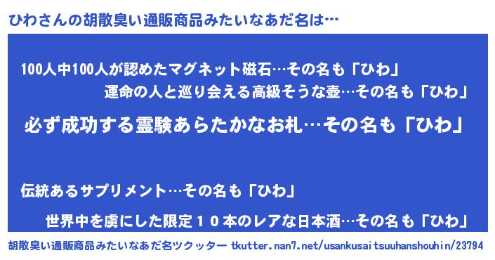 | ヒーロー風カッコイイあだ名 | 『スーパーヒワ』『友情の使者ひわ』 |
