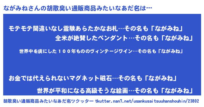 | 男性向けラノベタイトル風あだ名 | 『この素晴らしい世界にながみねを!』 |