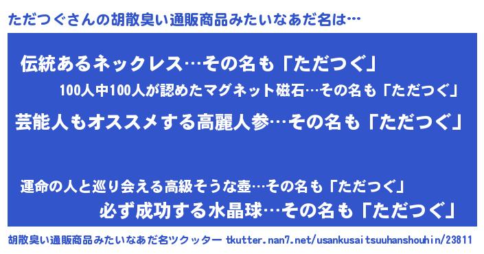| 男性向けラノベタイトル風あだ名 | 『ただつぐに滅ぼされるだけの簡単なお仕事です』 |