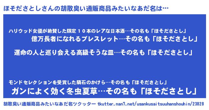 | 男性向けラノベタイトル風あだ名 | 『ほそださとし~年齢イコール彼女いない歴の魔法使い~』 |