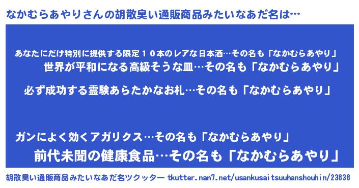| ヘコむあだ名 | 『なかっふぃ~』『なかむらあやり(笑)』 |