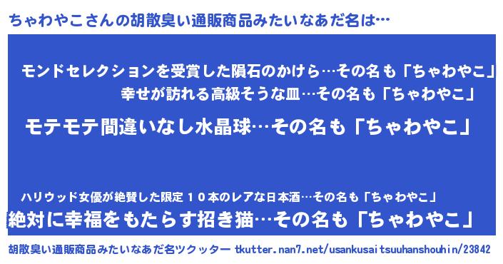 | 男性向けラノベタイトル風あだ名 | 『ちゃわやこの憂鬱』『緋弾のチャワヤコ』 |