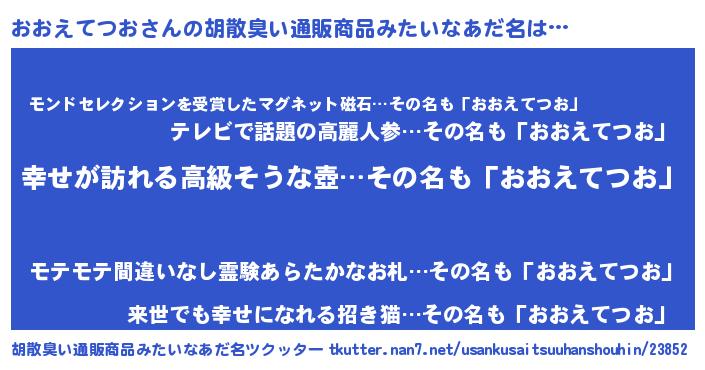 | 女子向けラノベタイトル風あだ名 | 『おおえてつおの雑貨屋さん』 |