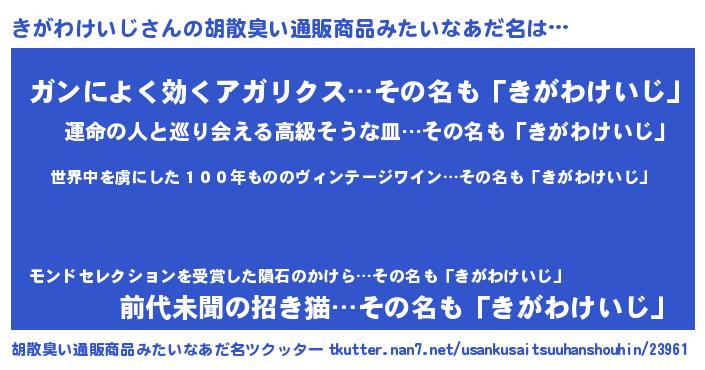 | 意味不明あだ名 | 『住所不定無職きがわけいじ(8歳)』 |
