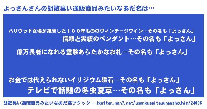 | 欧米人風あだ名 | 『マイケルよっさん』『ウサインよっさん』 |