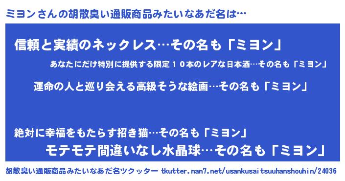 | 欧米人風あだ名 | 『アンジェラ・ミヨン』『ウサインミヨン』 |