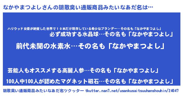 | ヘコむあだ名 | 『なかやまつよし(苦笑)』『なかっふぃ~』 |