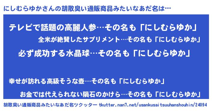 | ヒーロー風カッコイイあだ名 | 『スーパーニシムラユカ』『幻影騎士ニシ』 |