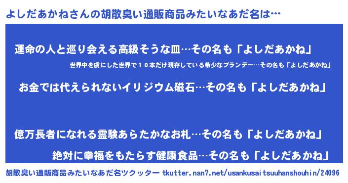 | ヘコむあだ名 | 『豆乳』『よしだあかね(苦笑)』 |
