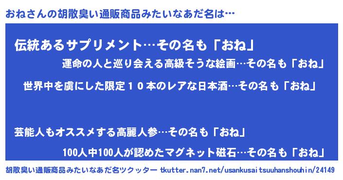 | 意味不明あだ名 | 『住所不定無職おね(14歳)』 |