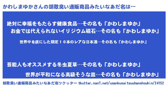 | 男性向けラノベタイトル風あだ名 | 『この素晴らしい世界にかわしまゆかを!』 |