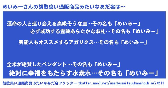| 男性向けラノベタイトル風あだ名 | 『Re:めいみーから始める異世界生活』 |
