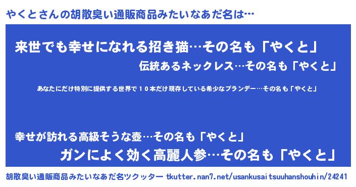 | 意味不明あだ名 | 『住所不定無職やくと(86歳)』『自称やくと』 |