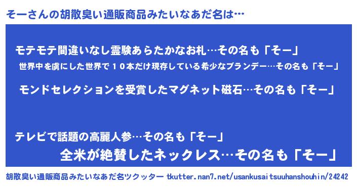 | 男性向けラノベタイトル風あだ名 | 『ノーゲーム・ノーソー』『そーの憂鬱』 |