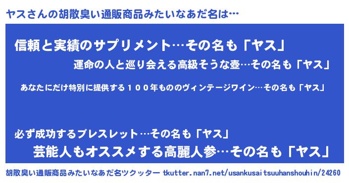 | 男性向けラノベタイトル風あだ名 | 『この素晴らしい世界にヤスを!』 |
