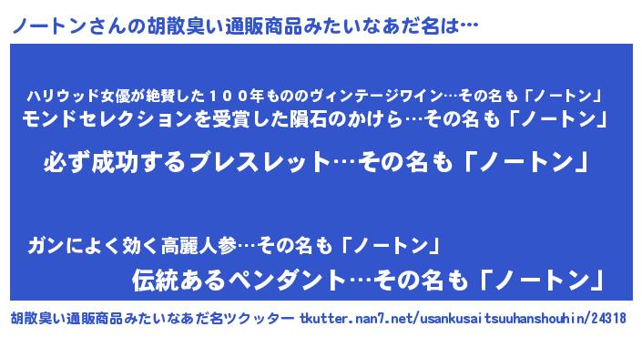 | 男性向けラノベタイトル風あだ名 | 『ノートンの憂鬱』『魔弾の王とノートン』 |