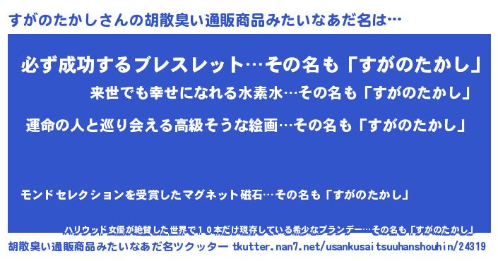 | 恥ずかしいあだ名 | 『すがっちょ』『プリティーすがのたかし』 |