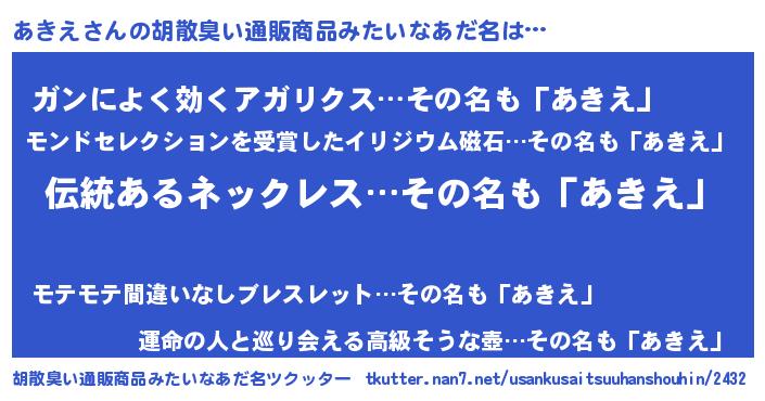 | 恥ずかしいあだ名 | 『アキリンリン』『アキエデラックス』 |