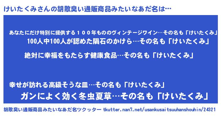 | 男性向けラノベタイトル風あだ名 | 『けいたくみという概念が存在しない退屈な世界 』 |