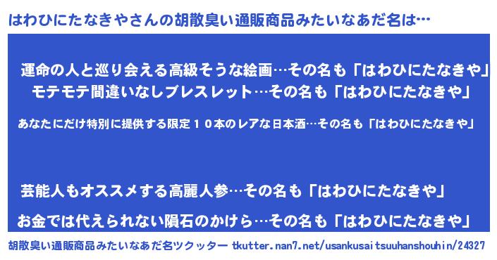 | 意味不明あだ名 | 『住所不定無職はわひにたなきや(39歳)』 |