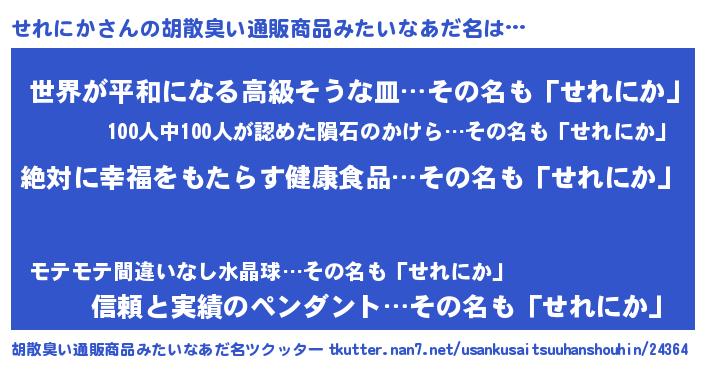 | ヘコむあだ名 | 『せれにか(苦笑)』『豆乳』 |