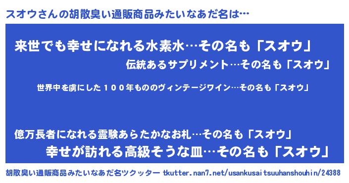 | 男性向けラノベタイトル風あだ名 | 『この素晴らしい世界にスオウを!』 |
